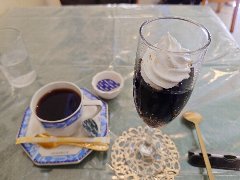 本所吾妻橋駅から南に6、7分、区役所通りの1本西側の路地にあります。2階建ての1階です。レンガの外壁アーチ型の窓が特徴的です。店内は、カウンター席が4つ、テーブルが5つありました。レトロな雰囲気、ちょっとスナック感があります。とあるゲームの聖地になってるらしいです。女将は気さくな方です。喋り過ぎでなかなか注文が進まなくて見てると面白いです。ブレンドコーヒー(400円)とアイスクリーム(500円)を注文しました。コーヒーはハンドドリップで淹れます。コーヒーは飲みやすかったです。バニラアイスはやや濃厚でした。美味しかったです。他には、各種ドリンク、トースト、サンドウィッチ、パフェなどがありました。けっこう混んでいました。 |
