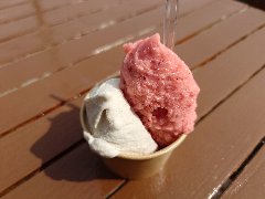 修善寺  | 洋菓子 | 静岡県伊豆市修善寺 | ★ (2014.3.29)  | 普通 | ![]()  | 修善寺温泉、独鈷の湯のすぐ近くにあります。おみやげ処甘泉楼の中にあります。出来たばかりのきれいな複合お土産屋です。その中で漬物などの扱うお店の一部で豆腐のジェラートが売られています。メニューにあったいちご最中(250円)+コーヒー(200円)を食べました。いちご最中には苺のジェラートと苺が皮で挟まれています。食べてる途中で豆腐のジェラートを試食で頂きました。甘さがかなり控え目でほとんど豆乳でした。さっぱりとして美味しかったです。 |
