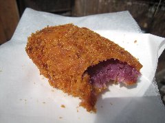 | 円覚寺、黄梅院のみつまた | 北鎌倉、「いも吉館」の紫芋コロッケ (アツアツです) |