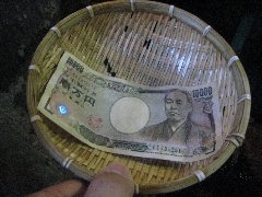 | 水で洗ってよれよれになった一万円札 (ザルに入れて洗います) |