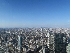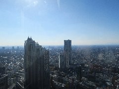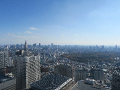 | 都庁45階の南展望室、東方向の景色、高さは202mだそうです。 | 南展望室からの南方向の景色、明治神宮の森が見えています。 | 南展望室からの南西方向の景色、うっすら丹沢が見えます。 | 南展望室からの北西方向の景色、中野方面が見えます。 |