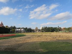 | 代々木Village内の「代々木カリー」にあったソファテーブルのこたつ。面白いです。 | 「代々木カリー」の舌平目のバターレモンカリー。美味しいです。 | 新国立競技場の建設予定地、高い壁に囲まれています。 | 神宮外苑の軟式野球場、奥に絵画館が見えます。 |