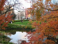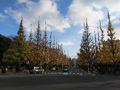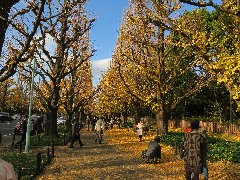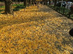 | 神宮外苑の銀杏並木、いまや観光名所。 | 神宮外苑の銀杏並木、もうかなり葉が落ちています。 | 神宮外苑の銀杏並木、落ち葉のじゅうたん。きれいだけどちょっと臭い・・・ | 六本木ヒルズからの毛利庭園とテレビ朝日。 |