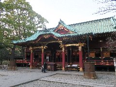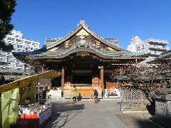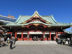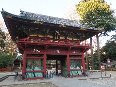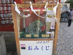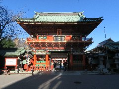 | 神田明神の随神門。総檜、入母屋造だそうです。 | 神田明神の御神殿。昭和9年の竣工の鉄筋の建物だそうです。 | 神馬・神幸号、黒い毛ですが芦毛だそうです。おとなしいです。 | 電動おみくじ、箱の中は何故か獅子舞です。 |