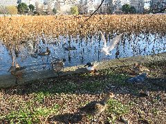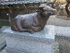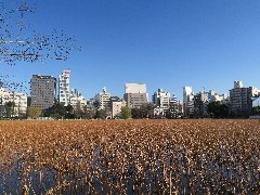 | 湯島天神の本殿、学問の神様、菅原道真が祀られています。 | 湯島天神の撫で牛、天神さまと牛はいろいろ縁があるそうです。 | 不忍池、枯れた蓮に覆われています。池の向こうは上野のビル群です。 | 不忍池、すぐそこにいろいろな鳥がいっぱいいます。種類は分かりません。 |