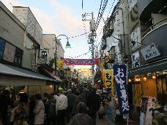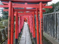 | 根津神社の社殿、静かで落ち着きます。 | 根津神社の境内にある乙女稲荷神社。鳥居がたくさん並んでいます。 | 谷中の路地、曲がりくねっています。たまにお店があります。 | 谷中ぎんざ、びっくり市開催日で平日ですがかなり混んでいます。 |
