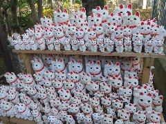 | 豪徳寺、高い松の参道です。 | 豪徳寺、三重塔。静かです。落ち着きますな〜 | 豪徳寺、仏殿。近江彦根藩第2代藩主、井伊直政、縁のお寺です。 | 豪徳寺、招福殿。こちらの脇には・・・ |