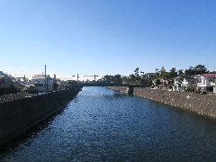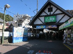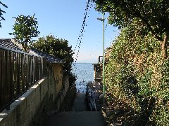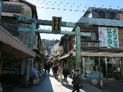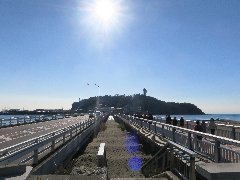 | 鵠沼駅近くの境川、海が近い雰囲気です。 | 江ノ電の江ノ島駅。 | 江の島へ渡る橋、今日はいい天気ですね〜 | 江の島、江島神社へ続く参道、かなり混んでいます。 |