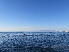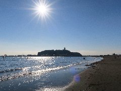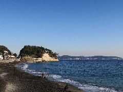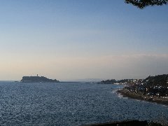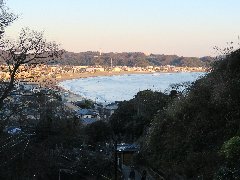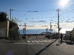 | 江の島からの景色、箱根方面が見えますが富士山は見えません。 | 江の島の路地、海が見えます。細い路地がいっぱいあります。 | 東浜海水浴場からの江の島、寒いのに結構サーファーがいます。 | 龍口寺前交差点の悠々と横切る江ノ電、警備員が2人いました。 |