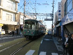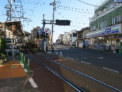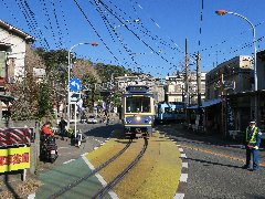 | 狭い道の真ん中を走る江ノ電。車が避けています。 | 江ノ電の腰越駅前、ここで線路と道路が分離します。 | 鎌倉高校前駅の近く、江ノ電と言えばやっぱり海ですよね。 | 鎌倉高校前駅の交差点、いろいろなドラマで使われます。 |