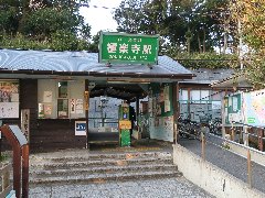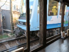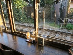 | 「ヨリドコロ」のおいしいあんみつとカフェラテ。 | 「ヨリドコロ」、江ノ電が来ました。かなり近いし揺れますw | 江ノ電の極楽寺駅、趣ありますね〜 | 極楽寺、茅葺き屋根の山門です。なんか頭でっかちな感じw |