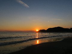 | 極楽寺の本堂、桜の頃がいいみたいです。 | 成就院の階段からの景色、由比ヶ浜が見えます。 | 成就院の本堂、アジサイのお寺として有名です。 | 由比ヶ浜、稲村ヶ崎方面に沈む夕日。とてもきれいでした。 |