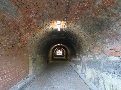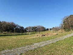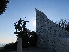 | 国道16号脇の展望台からの景色。今歩いてきた方面が見えます。 | 観音崎公園の花の広場、山の中ですがここだけ広いです。 | 観音崎公園、戦没船員の碑。大きくてアートな碑です。 | 観音崎公園のレンガのトンネル、こんなトンネルがいくつもあります。 |