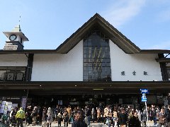 | 鎌倉駅、いつもの賑わいです。 | 鎌倉、「ふくや」の外観、山形料理をいただけます。 | 「ふくや」のつったい肉そばと玉こんにゃく、つったりとは冷たいです。 | 桜でしょうか?結構咲いています。 |