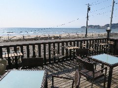 | 「べつばらドーナツ」のレモンドーナツとチョコレートドーナツ、美味しいです。 | 材木座海岸、雲1つありません。由比ヶ浜に続いています。 | 「ホア カフェ」のテラス席、材木座海岸が目の前です。 | 「ホア カフェ」のホットコーヒー。海を眺めながらの一服です。 |