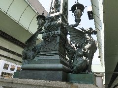 | 日本橋のある麒麟の銅像、映画で有名になりましたね。 | 日本橋、日本国道路元標。日本の道路の起終点です。 | 日本橋の蕎麦屋、「紅葉川」の外観。かなりの好立地です。 | 「紅葉川」の名物、鴨せいろ。美味しいです。 |