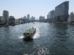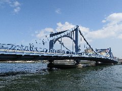 | 「しばらく」の辛子高菜ラーメン。博多ラーメンのお店です。 | 隅田川に架かる清洲橋、日本では珍しい自碇式連続補剛吊橋なのだそうです。 | 清洲橋の上からの景色。多くの船が行き交います。 | 清澄公園の広場。清澄庭園の隣です。 |