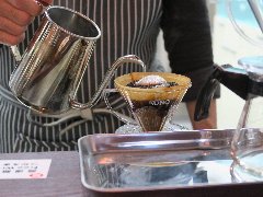 | 清澄白河、「Cafe de kousaian」の外観、和風なカフェです。 | 「Cafe de kousaian」のコーヒー、じっくりドリップします。 | 「Cafe de kousaian」のブレンドコーヒーと葛まんしまゅう黒蜜きな粉アイス添え。 | 大横川と小名木川が交差します。どちらも運河です。スカイツリーが見えてます。 |