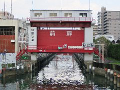 | 小名木川に架かる新扇橋、橋に船用の信号が付いています。 | 小名木川の扇橋閘門、2つの閘門で水位を変えて船が進みます。 | 住吉、「ヒヨシヤ」の外観、地元のパン屋といった雰囲気です。 | 「ヒヨシヤ」のパン、大ぶりで安くて嬉しいです。 |