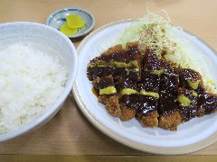 「松屋」のみそかつライス (最初からソースとからしが掛かっています) |