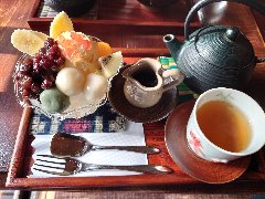 「金魚の栖」の自家製大納言白玉クリーム (お茶は加賀棒ほうじ茶) |