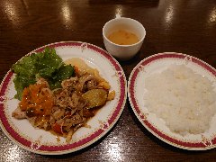 「らんぶる」の本日のランチ (チキンソテーと豚肉の焼肉) |