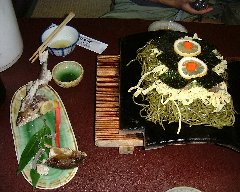 | 川棚温泉、「たかせ」の瓦そば (瓦の上で茶そばが焼かれています) |