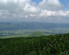 大観峰、カルデラの縁とカルデラ内の水田 | 阿蘇パノラマラインからの米塚 (すり鉢を逆さにしたような小さな山) |