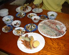 天草下島、民宿「やまかく」の夕飯 (これで一泊5000円、安い!) |