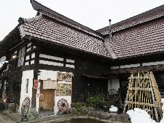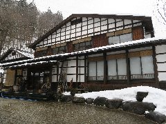 | 「貝掛温泉」の外観。立派な建物です。 | 「貝掛温泉」の露天風呂、雪が降ってきて気持ちいい〜 | 「貝掛温泉」のロビーの囲炉裏。関内は整備が行き届いています。 | 越後湯沢、「レストランゆざわ」のポークカツレツ、越後もちぶた使用。 |