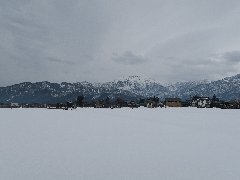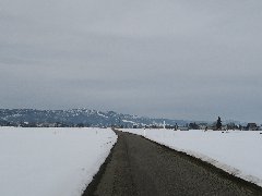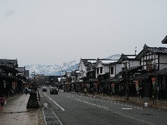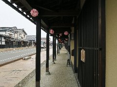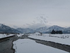 | 塩沢宿、牧之通りの風景、雪が全然無い・・・ | 牧之通りの雁木、豪雪の中の雁木の風景を期待していましたが・・・ | 六日町付近の田んぼ、真っ白です。 | 六日町付近の田んぼの道、真っ白です。 |