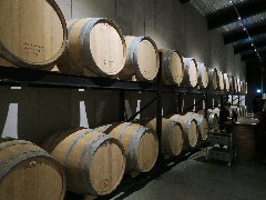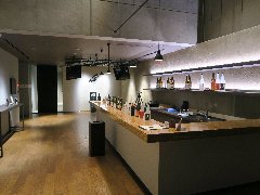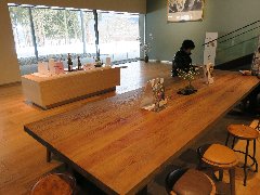 | 魚沼の里、「八海山雪室」の焼酎貯蔵庫。雪室は雪を使った冷蔵庫です。 | 「八海山雪室」のお洒落なバーカウンター。八海山などを試飲が出来ます。 | 「八海山雪室」にある雪室カフェ、雪室珈琲を頂きました。 | 雪室カフェの内観。どこも贅沢な作りです。 |