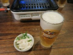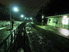 | 岩原スキー場前駅、これから越後湯沢に電車で飲みに行きます。 | 越後湯沢、「ひびき」の外観。ホルモン、焼肉屋です。 | 大混雑の越後湯沢の夜、ようやくビールにありつけました。 | 「ひびき」のタン塩とハラミ。美味しいです。 |