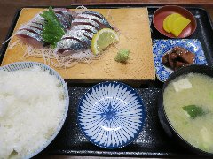 「市場食堂 城南店」の首折れサバ刺定 (ゴマサバの刺身です) |