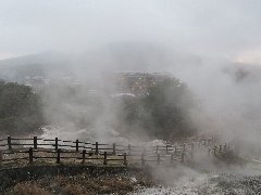 雲仙獄温の風景 (そこら中から噴煙、さらに雪降ってます) |