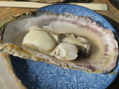 「丸強水産カキ小屋」の巨大カキ (炭火で焼きます) |