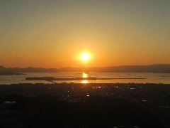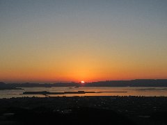 | 大村市の山の中腹からの夕陽@ (島のように見えるのは長崎空港) |