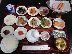 「肘折温泉 松屋」の朝食 (品数豊富で嬉しいです) |