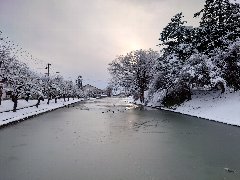 新庄市、新庄城址のお濠 (水が凍っています) |