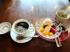 「茶房やまだ屋」の雪室珈琲とクリームあんみつ (オレンジ色の丸いのは白玉です) |