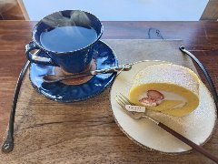 「分家玉や」のブレンドコーヒーと米粉ロール (お洒落なお店です) |