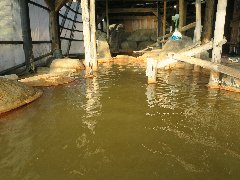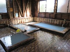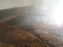 (塩化物泉)川内駅から東に16kmほど、国道328号の交差点からから1.4kmほど道を進むと唐突にあります。山間の長閑なところです。開湯から300年経つそうです。道路に面して看板があり、坂の下に入口があります。入口の建物で料金を払い、一度外に出ると浴場があります。男湯は浴室が2つあり左右対称の造り、元々男女別の浴室をどちらも男湯にした感じです。左右でお湯の色が少し違う気がしました。それぞれの浴室には内湯が2つずつあります。湯口がある方は広くて熱く、もう一方は狭くて温いです。お湯は茶色っぽく濁っていて、大量に床へ掛け流されていました。浴槽の床面は析出物で覆われていて幾何学模様のようになっていました。温泉には金を含むたくさんの温泉成分が含まれているそうです。露天風呂も1つありました。とても効きそうな温泉でした。しかも安いです。 |