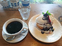 ![]() | 二本松駅から10kmほど、国道459号沿い、岳温泉街の交差点にあります。2階建ての洋風な建物です。店内は、カウンター席が2つ、丸テーブルが1つ、テーブルが1つありました。2階にもテーブルがあります。ログハウス風で木がふんだんに使われていました。薪ストーブがありました。ブレンドとパウンドケーキ(バナナ)(1110円)を注文しました。コーヒーはハンドドリップで淹れます。飲みやすかったです。ケーキにはフルーツと生クリームが添えられます。しっとりともっちりしていてほのかにバナナを感じられます。美味しかったです。他には、各種ドリンク、レモンのパウンドケーキ、クリームあんみつなどがありました。 |
