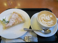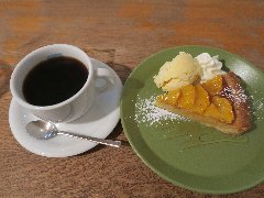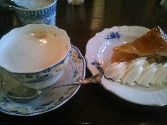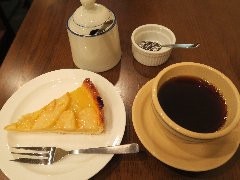 淡路町駅から1分、靖国通りから路地を入ったところにあります。植木に囲まれてひっそりとあります。店内は、カウンター席が5つ、テーブル席が多数、二階にもテーブルがあります。ジャズが流れお洒落で落ち着いた雰囲気で、ちょっと薄暗いです。カウンターの向こうはずらりとカップが並んでいます。土地柄、サラリーマンが多いようです。カフェオレ(550円)とアップルパイ(450円)を注文しました(セットで900円)。カフェオレはパリ風だそうでミルクがたっぷり入っています。アップルパイには生クリームがたっぷり添えられていました。人気があるお店です。 |
