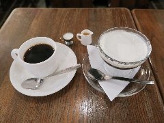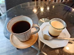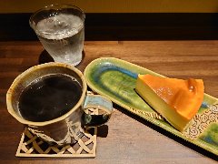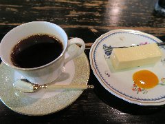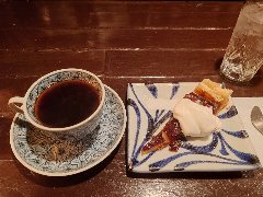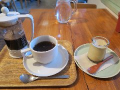 門前仲町駅から3分ほど、門前仲町交差点の北側の路地にあります。2階建ての古い建物です。ガラス戸の外観です。店内は、カウンター席が4つ、狭いです。リノベされたシンプルな内装です。音楽小さめ、のんびりムードです。お冷ではなく温かいレモン水が出されます。ホットコーヒー(500円)とプリン(350円)を注文しました。コーヒーは目の前でハンドドリップで淹れます。バランスいいです。プリンは柔らかめ、カラメルはやや甘めでした。美味しかったです。他には、各種ドリンク、ホットサンドイッチ、パウンドケーキなどがありました。 |
