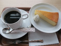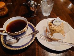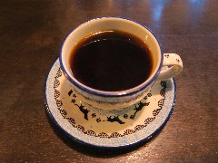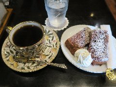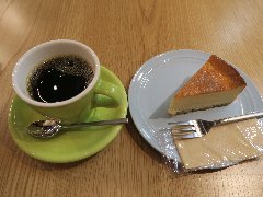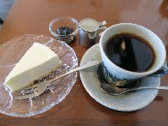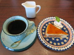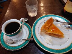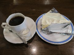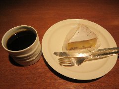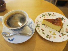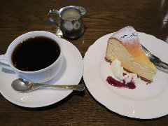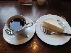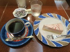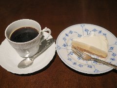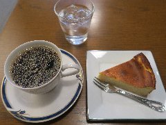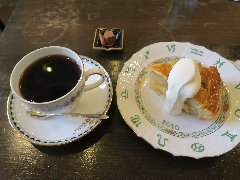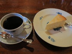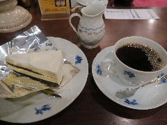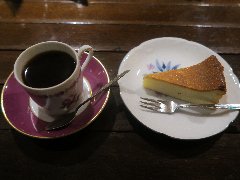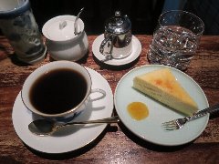神保町駅から4、5分、駿河台下の交差点の近くにあります。店内は、カウンター席が10、テーブルが2つ、大テーブルが1つありました。黒い塗装がはがれた古びたカウンターが渋いです。カウンター内の壁の棚にはたくさんのカップが並んでいます。少し薄暗く静かで落ち着いた雰囲気です。壁には皿や照明などが飾ってありますが値札が付いておるものもありました。古瀬戸ブレンド(苦み)(540円)とチーズケーキ(480円、セットで50引き)を注文しました。カップは壁の棚のカップから自分で選べるようです。注文後に豆を挽いてドリップしていました。チーズケーキは濃厚でコーヒーとよく合います。 |