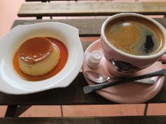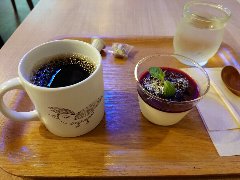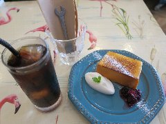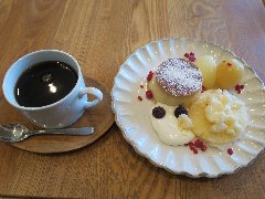 門前仲町駅から5、6分、古石場川親水公園沿いにあります。緑に囲まれた集合住宅の1階にあります。店内は、テーブル席が4つ、ソファー席が1つ、川が見えるテラス席もあります。店名の通り、ドライフラワーや植物がたくさん飾られています。明るくて和む雰囲気です。ハンドドリップコーヒー(432円)とデザート(2種類)(648円、セットで100円引き)を注文しました。コーヒーはブラジル産の深煎りです。デザートは5種類から選びます。フルーツコンポーと焼きプリンを選びました。プリンと冷凍パイナップル、リンゴ、ブルーベリーなどが入っていました。どちらも美味しかったです。他には、各種ハーブティー、スムージー、あずきスペシャル、キッシュ、肉、魚のランチなどがありました。のんびり出来ました。 |