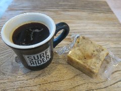 東大島駅大島口から5、6分、旧中川の土手、中川大橋の近くにあります。平屋の建物です。黒壁でガラス戸は開けられオープンな外観です。店内は、テーブルが3つ、カウンターが2つ、テラス席もあります。スェーデンスタイルのお店だそうです。目の前に川が見えて開放的です。コールドブリュー(610円)、ダムスーガレ(350円)、チョコレートボール(250円)を注文しました。コーヒーは苦めですっきりしていました。ダムスーガレはややお酒の香り、お菓子はどちらも甘め、ちょっと日本的ではない味わいでした。美味しかったです。他には、各種ドリンク、ホットドッグ、サンドイッチ、フラーラなどがありました。 |