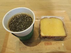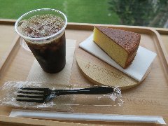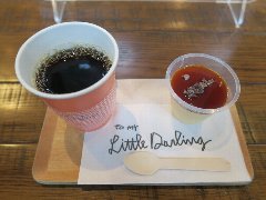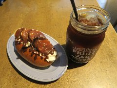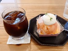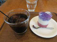 新豊洲駅から3分ほど、東雲運河沿いにあるビルの1階にあります。ガラス張りの外観です。店内は、入口付近にはパン売り場、奥にテーブルが多数、テラス席もありました。明るくてきれいです。大きな窓からは運河が見えます。トラジャブレンド(アイス)(418円)とオルタンシア(470円)を注文しました。コーヒーはやや酸味がありすっきりしていました。オルタンシアは紫陽花の意味、白いババロア?の上にレモンとブルーベリーのゼリーが乗っていました。爽やかな酸味でした。美味しかったです。他には、各種ドリンク、各種パン、ピザ、パスタ、お酒などがありました。 |