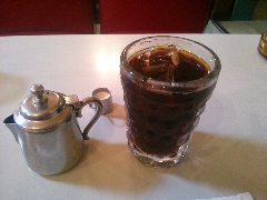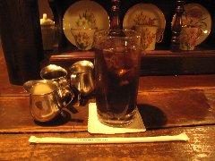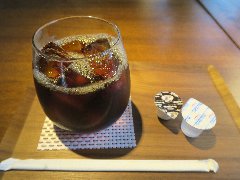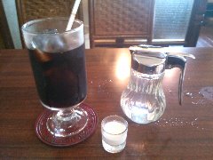神保町駅から小川町方面に1分、地下にあります。伯刺西爾はブラジルと読みます。店内は少し薄暗く、古い柱時計などレトロな雰囲気が漂います。カウンター席が4つ、テーブル席が多数あります。何故か囲炉裏があるテーブルもあります。静かで落ち着くお店です。コーヒーの淹れ方には拘りがあるようです。アイスコーヒー(550円)を注文しました。シロップが2種類、普通のシロップとカラメルシロップが付きます。ストレートコーヒーもいろいろありますが安いです。 |